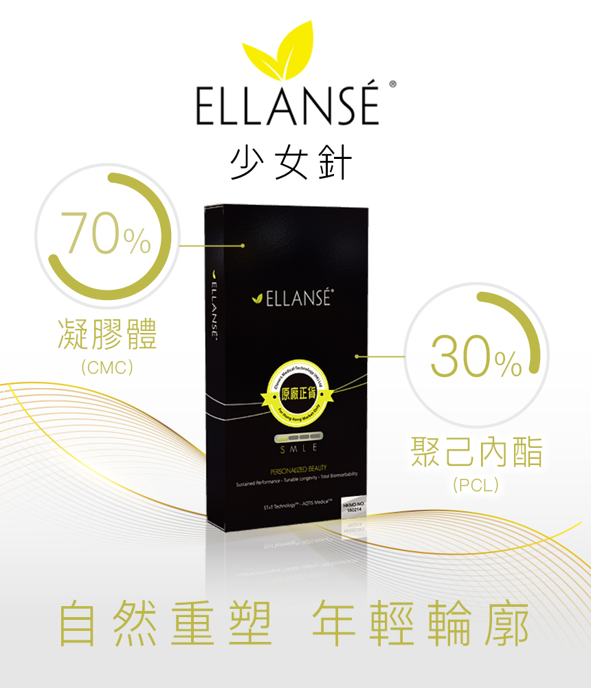 Ellanse少女針是新一代膠原蛋白再生填充劑,含70%CMC凝膠和30%PCL微晶球成分,能即時填充凹陷的肌膚組織,並長期維持膠原新生的效果,提升輪廓回復緊緻,有效減淡法令紋、眼紋、淚溝、皺紋,1次持效2年。