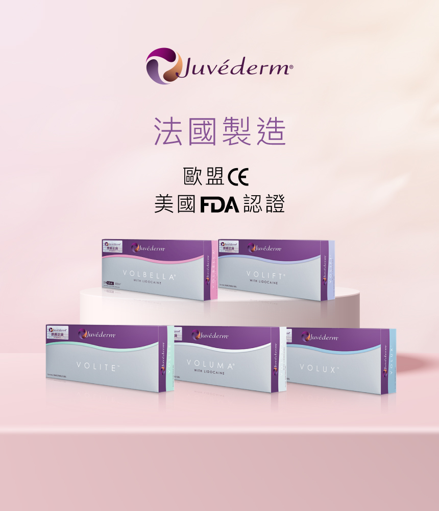 Juvederm® 喬雅登法國製造,蘊含由天然多糖體製造而成的透明質酸,具有自然填充作用,能為肌膚提供支撐及增強密度,有效提升面部輪廓,同時更能從肌底深層補濕,長效改善膚質,效果可達2年。
